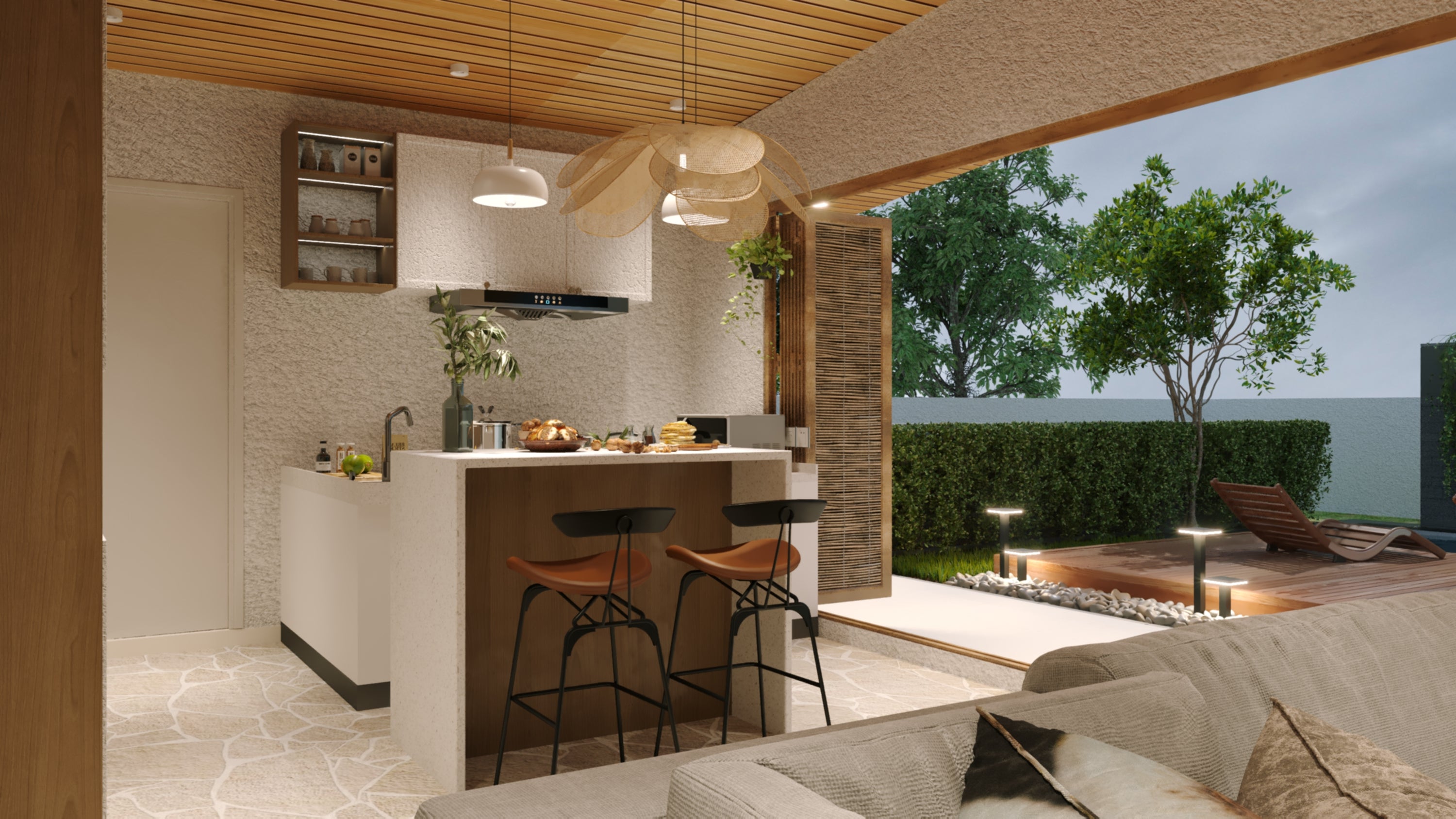 Acentos de madera cálida, iluminación moderna y paleta de colores neutros.